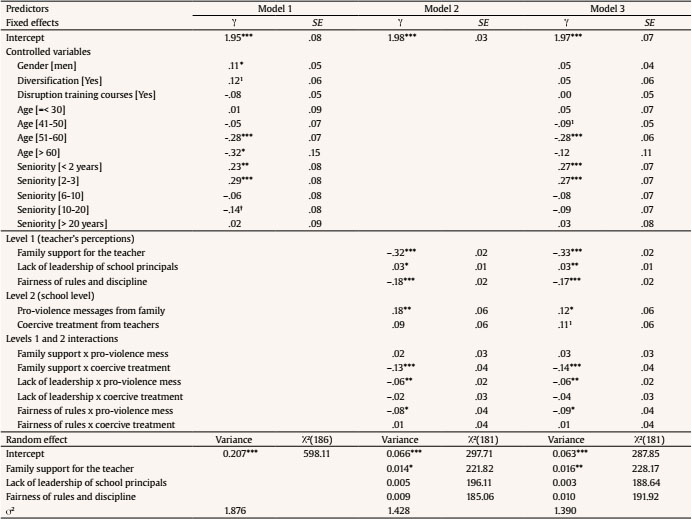 In turn, level-1 predictors also maintain a similar share in the equation (see Table 4) with respect to model 2. For level-2 variables, perception of coercive treatment from teachers becomes marginally significant, while the variable of pro-violence family messages shows a similar relationship to the previous one.