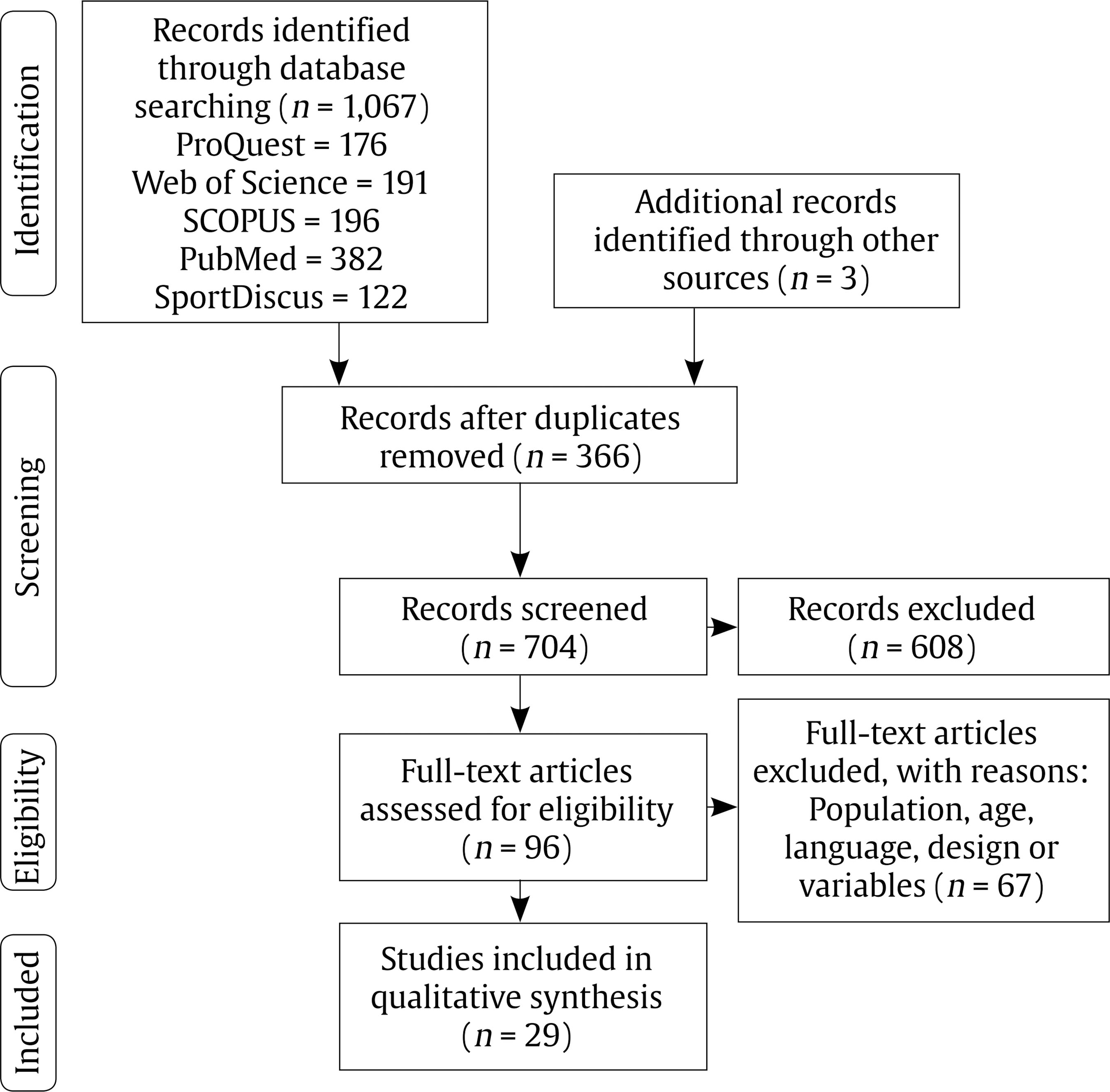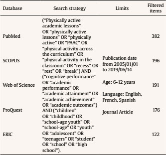 This study shares the same structure as other systematic reviews (Cerrillo-Urbina et al., 2015; Suarez-Manzano et al., 2018) and follows PRISMA’s guidance (Beller et al., 2013). A comprehensive search of five databases (PubMed, SCOPUS, Web of Science, ProQuest, and SportDiscus) for relevant items published between January 2005 and June 2019 was undertaken. Table 1 shows the main search terms and search strings that were used: 1) physical activity across curriculum (physical activity across the curriculum, physically active lessons, physically active academic lessons, physical activity in the classroom, recess, lesson break); 2) cognition (cognition, cognitive, cognitive performance, executive function, attention, academic, academic performance, academic attainment, academic achievement); 3) children (children, childhood, school-age youth, school-age, youth, adolescent, teenagers, student, school, high school).