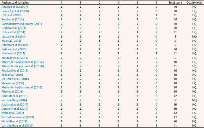 In spite of the above evidence, the traditional educational system forces children to remain sedentary most of the time during classes (Steele et al., 2010). In most countries Physical Education is given relatively little time in the curriculum (around 2h/week) and just 10-16% of this time is spent in MVPA (Calahorro-Cañada et al., 2016). In general, children aged 12-13 years spend just 5% of school time in MVPA (Da Costa et al., 2017). Specifically, the most recent studies in Spanish children and adolescents also show that PA levels are very low during school hours, recess, and Physical Education lessons (Grao-Cruces et al., 2019). Therefore, new strategies to increase the amount and intensity of physical activity (PA) children do in school, outside of Physical Education classes, are being introduced. These include PA in academic lessons (PAAL) method, in which PA is incorporated into academic instruction, i.e., children jump between numbers or words to solve a maths problem or group a family words together (Donnelly et al., 2009; Mullender-Wijnsma et al., 2016). Other methods are the use of active lesson breaks (ALB), shorts breaks between or within academic lessons (Janssen et al., 2014) and active recess (AR) approach, which involves children spending a short period of time, during breaks or at lunchtime, in moderate-vigorous motor activities designed to improve selective attention and behaviour (Altenburg et al., 2015). Finnally, we refer to the use of more than one of these methods of increasing school-time PA as a combined PA (CPA) intervention.