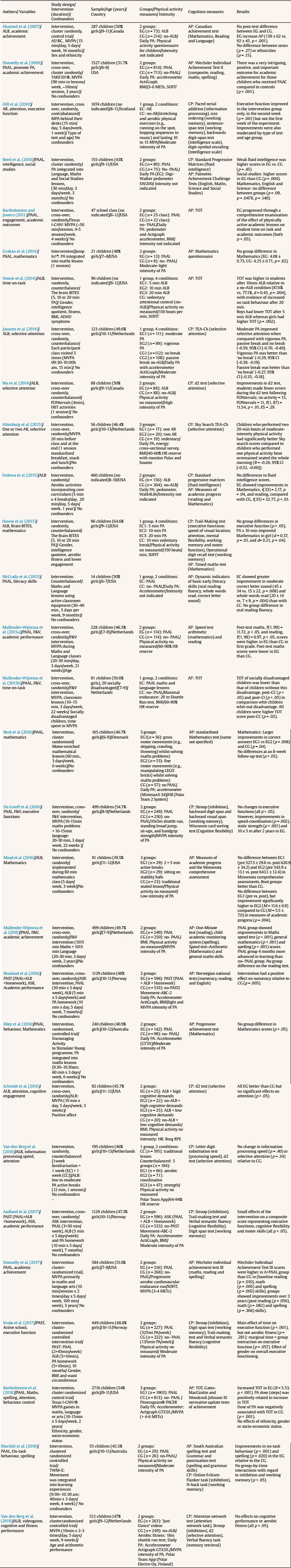 Of the 14 studies that used a PAAL intervention just seven completed the entire active lesson (> 40 min), the rest of them incorporated 10-30 min of PA into lessons. Neither a four-week Thinking While Moving in English programme (40 min x 3 days/week; Mavilidi et al., 2018) nor a 22-week PAAL intervention involving Language classes (15-20 min/day x 2-3 days/week; de Greeff et al. 2016) improved inhibition, working memory, or cognitive flexibility in medium to long-term. However, incorporating 30 min of PA into Mathematics, Language, and Social Science classes (3 days/week x 3 months) produced improvements in fluid intelligence (Reed et al., 2010). A two-year intervention based on the F&V programme (MVPA during 10-15 min x 3 days/week; Mullender-Wijnsma et al., 2015a, 2015b) and TEXAS-I CAN!® programme (MVPA during 10-15min x 5 days/week; Bartholomew et al., 2018) produced positive effects on performance on a time-on-task test. In both programmes, positive effects on academic performance were observed from the fourth week of intervention.