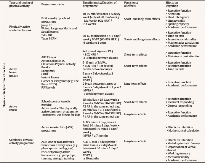 ABSTRACT: This review analyses educational intervention studies that have researched the effects of physical activity in school on schoolchildren’s cognition. Twenty-nine intervention studies carried out between January 2005 and the end of June 2019 were retrieved from five databases. Fourteen papers analysed the physically activity in academic lessons (PAAL) method, nine analysed the effects of active lesson breaks (ALB), two analysed active recess (AR) intervention, and three analysed combined physical activity (CPA) interventions consisting of two or more types of physical activity. Physical activity in school time has acute and chronic positive effects on cognition in children. In all the interventions (PAAL, ALB, AR, and CPA) short-term high-intensity physical activity sessions improved cognitive performance. Medium- to long-term moderate vigorous physical activity sessions also produced improvements in cognitive performance. The implications of including CPA programmes in the school timetable are discussed and practical guidelines with recommendations are offered.
