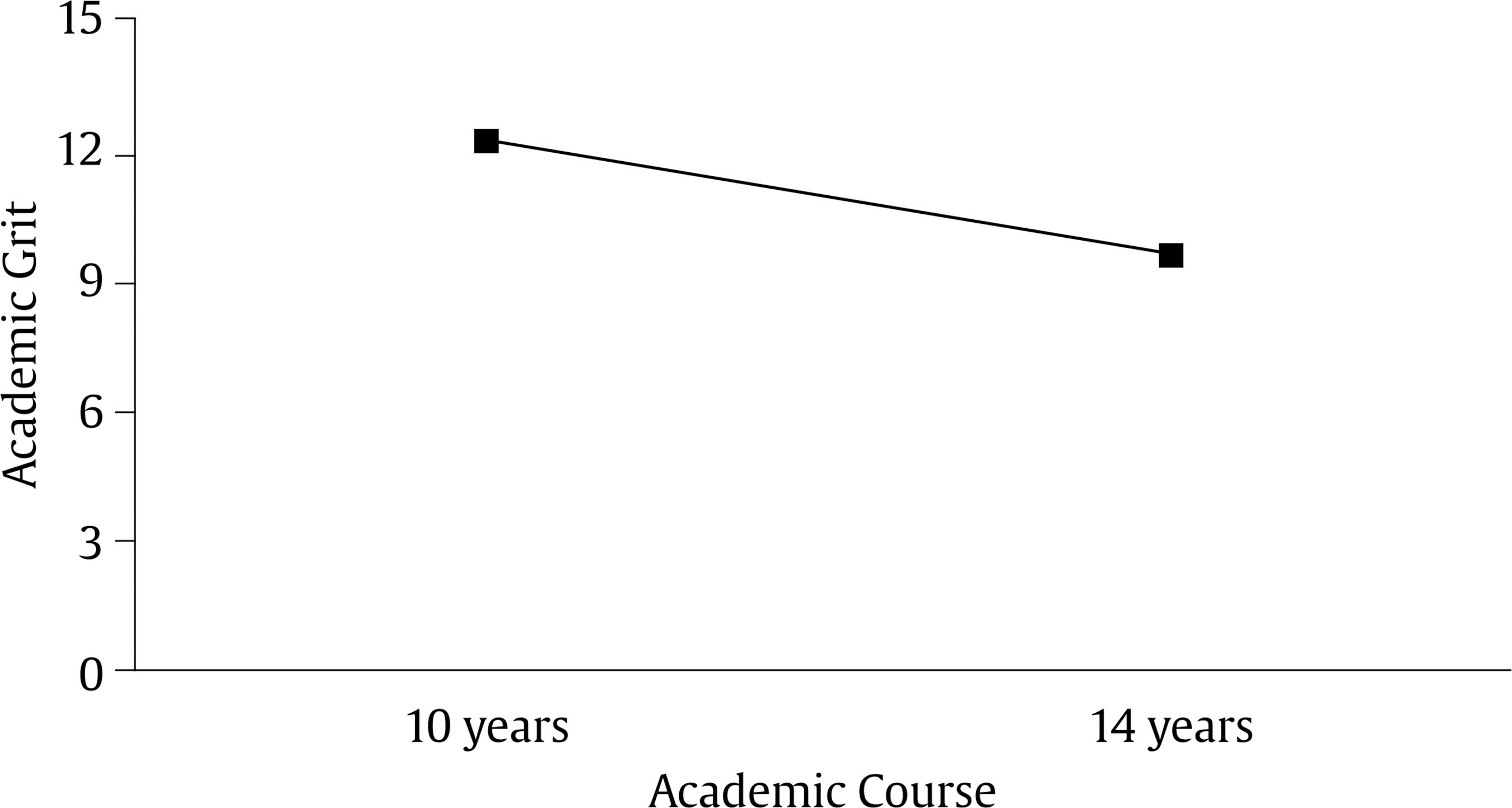 In terms of the progression of academic grit over time, we found that as adolescents got older, their levels of academic grit fell, which is in line with findings from previous studies (West et al., 2016). The fall in academic grit in the ages we studied (10-14 years) is outstanding, and it means that determination and pursuit of objectives is much worse in secondary school than in primary school. In terms of sex, and in line with results from other studies (Eskreis-Winkler et al., 2014; Oriol et al., 2017), girls scored higher in academic grit at both time-points, which indicates that girls demonstrate more determination and perseverance in an educational context between the ages of 10 and 14, adapting to school better than boys. When it comes to the progression of school performance over the six years of schooling, it is notable that school performance is constant in primary school, and declines when students start secondary school for the three subjects we looked at: Spanish, Maths, and English. This may be because, on the one hand, as students advance in their schooling, they have more challenges to face (Eurydice, 2018; Government of the Principality of Asturias, 2018), and on the other, a decline in non-cognitive variables such as academic grit. It is also worth noting that, despite the fall in school performance in all students, the girls had better grades throughout the period of their schooling that we studied, in line with previous studies (Voyer & Voyer, 2014).