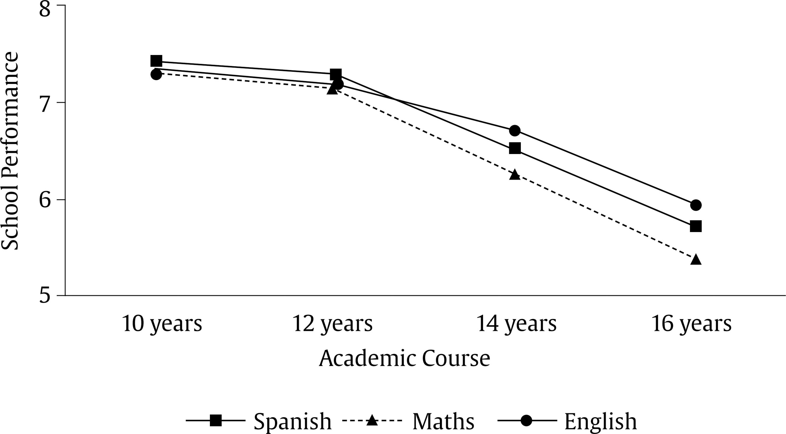 School performance. School performance was measured using the mean grade in the corresponding school year (grade point average, GPA) in Spanish Language, Maths, and English (foreign language) at four time-points (fourth and sixth year of primary school, and second and fourth year of secondary school). The grade ranges from 0 to 10 in the three subjects, where 0 is very poor performance and 10 is outstanding performance.