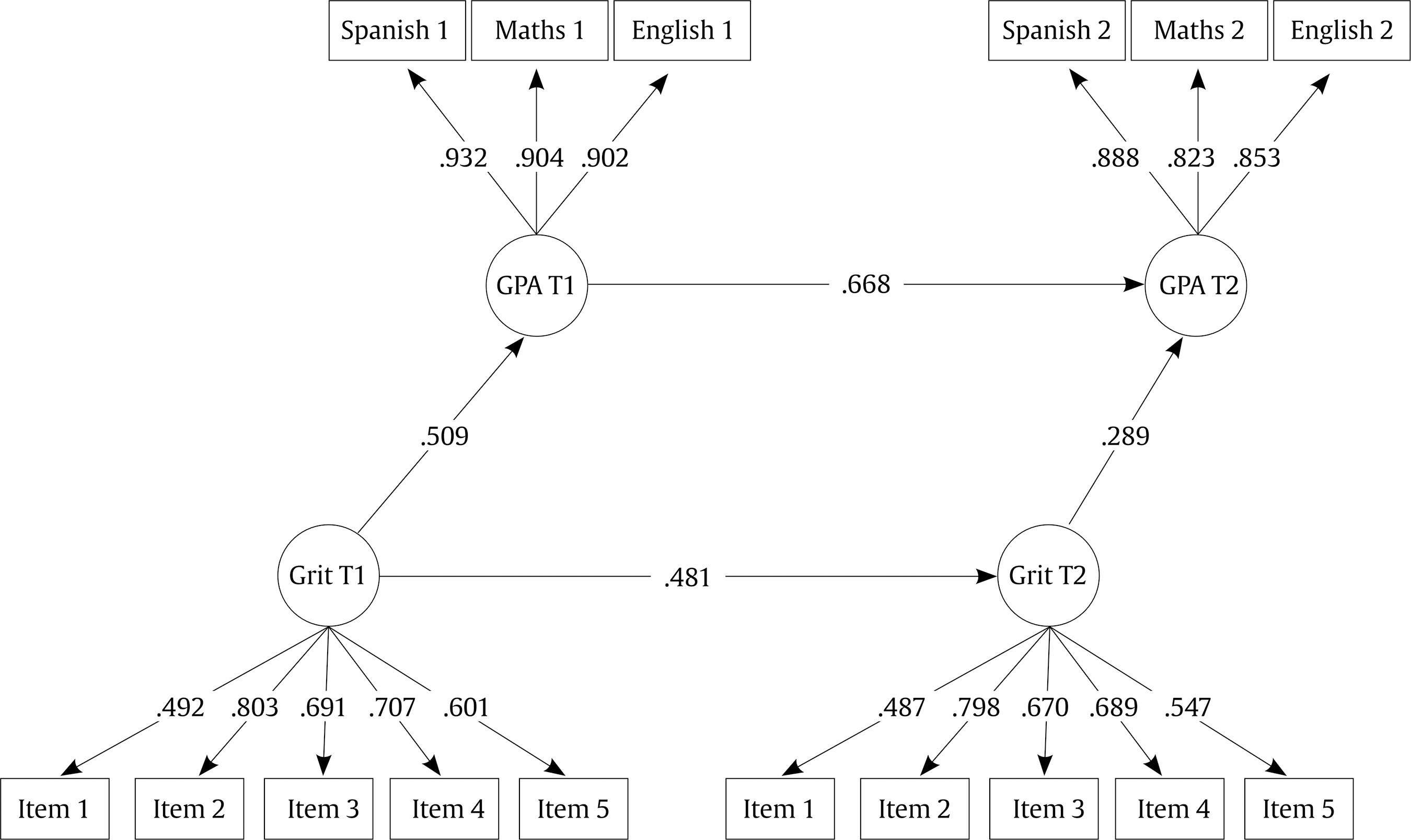 To date, very few studies have analysed the influence of grit on school performance longitudinally. In primary school students, Jiang et al. (2019) found that grit at the first time-point predicted subsequent school performance, controlling for previous achievement. Tang et al. (2019) found that grit at 13 or 14 years old (eighth grade) was related to academic success at 14 or 15 years old (ninth grade), after controlling for variables such as conscientiousness, prior academic achievement, and socioeconomic level.