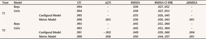 Descriptive statistics for items in the Academic Grit Scale are shown in Table 1. All of the items produced adequate indices of discrimination (Muñiz et al., 2005; Muñiz & Fonseca-Pedrero, 2019), between .399 and .536. The “a” parameter also yielded very high values for each of the items (Baker, 1985). In addition, it is worth highlighting the change in mean for item 1 (“I like studying”), between the first timepoint (1.94) and the second (0.99), which is explained mainly by reduced enjoyment of studying in the second year of secondary school. Bartlett statistic (p < .001) and KMO (> .78) at both time-points indicated the suitability of data for factor analysis. Despite the small number of items, the test exhibited good internal consistency at the first time point (α = .80, ω = .80) and was essentially unidimensional, based on the fact that the first factor explained 55.5% of the total variance, with excellent indices of fit (GFI = .999, RMSR = .022). At the second time-point, psychometric properties were similar. Internal consistency was adequate (α = .77, ω = .78) and the first factor explained 52.6% of variance, with very good indices of fit (GFI = .998, RMSR = .029). Factor loa-dings for all of the items were very high, between .523 and .748. According to this data, the scale should be considered essentially unidimensional (Calderón et al., 2019; Kline, 2011). Scores between two time-points showed temporal stability (r = .324 95% CI [.299, .349]), bearing in mind that there are four years of difference between both moments. Regarding to measurement invariance based on sex at two-time points (Table 2), invariance was confirmed at two levels examined (configural and metric) (Chen, 2007).