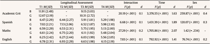 Following that, we analysed the differences in the progression of academic grit and school performance between boys and girls (Table 3). Interaction for academic grit was statistically significant (p < .001), but the effect size was null. This may be due to the large sample size used in the present study. In terms of principal effects, the most notable differences were in the Time variable, with a fall in means between the two time-points in both boys and girls (d = 1.63), with girls exhibiting higher scores in academic grit at both time-points. In school performance, girls also had higher means than boys at both time-points for each subject. Although the interaction was statistically significant, the effect size in the three subjects was null, so we moved on to examine principal effects. The Time variable exhibited notable differences in the three subjects (d > 1).
