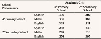 Transversal correlations between academic grit and school performance are given in Table 3, ranging from .295 to .396. Table 4 also shows longitudinal correlations between academic grit in fourth-year primary and school performance in second-year secondary, and between school performance in fourth-year primary and academic grit in second-year secondary, which range between .160 and .298.
