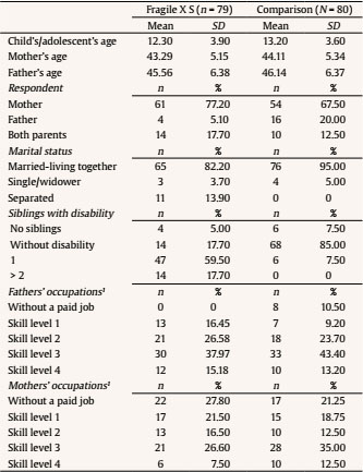 Table 1 includes family demographic information for the FXS and comparison groups. In both groups, questionnaire respondents were mothers (77.2% for FXS and 67.5% for the comparison group), and the majority of the parents were married or living together (82.2% for FXS and 95% for the comparison group). There were no statistically significant differences between the two groups of families on fathers age (range: 34-56), F(1, 158) = .329, p < .567, 2 = .002, or mothers age (range: 33-54), F(1, 158) = 4.781 p < .130, 2 = .003. Moreover, 77.2% of the children and adolescents with FXS had siblings with no disability, and 17.7% had more than two siblings with intellectual disabilities (range 2-4), whereas only 7.5% of the comparison children and adolescents had a sibling with a disability (see Table 1). Finally, with regard to occupations, most of the fathers had a paid job in both groups, whereas around 20% of mothers in both groups did not have a paid job. Occupations of fathers and mothers were distributed in four skill levels (see Table 1), in accordance with the international standard classification of occupations (International Labour Organization [ILO, 2012]).