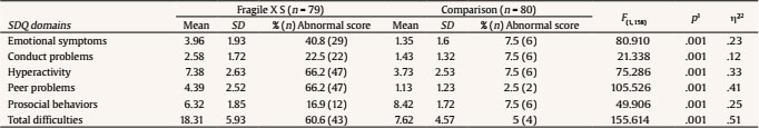 As Table 2 shows, the percentage of cases with abnormal scores was higher in the FXS group than in the comparison group. Thus, in the FXS group, the percentage of cases with abnormal scores ranged from 16.9% for prosocial behaviors to more than 60% for hyperactivity, peer problems, and total difficulties, whereas in the comparison group the percentage of cases with abnormal scores was below 7.6% on all scales (see Table 2).
