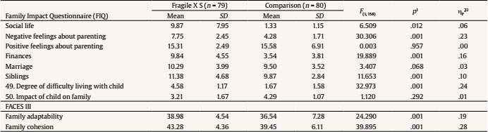 In relation to family adaptability and family cohesion, the ANCOVAs reported significant differences between groups. Thus, the FXS group scored higher than the comparison group on family adaptability, and family cohesion, with large effect sizes.
