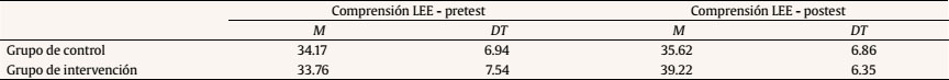 Comprensión Lectora LEE. Al analizar el efecto del programa de intervención, el ANOVA realizado detecta un efecto de interacción entre la condición de intervención y el tiempo entre las evaluaciones, F(1, 125) = 17.73, MSe = 13.47, p <.001, η2 = .124, por lo que hay un efecto significativo del programa sobre la comprensión. El efecto principal del tiempo fue significativo, F(1, 125) = 52.46, MSe = 13.47, p < .001, η2 = .296, pero no el del grupo, F(1, 125) = 1.825, MSe = 83.06, p = .179, η2 = .014. El efecto relevante es el de la interacción, donde el GI obtuvo mejores resultados que el GC únicamente en el postest: la comprensión media del GI fue de 39.23 y la del GC de 35.62 (diferencia significativa a favor del GI de 3.61 puntos, p = .003). En la medida pretest no se obtuvieron diferencias estadísticamente significativas (media GI = 33.76, media GC = 34.17, diferencia no significativa de .41, p = .763).