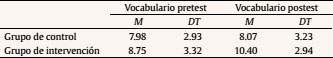 Vocabulario. El análisis de varianza realizado muestra un efecto de interacción entre la condición de intervención y el tiempo entre las evaluaciones, F(1, 120) = 13.187, MSe = 2.52, p < .001, η2 = .099. Al igual que en el análisis anterior, se detectó un efecto principal del tiempo, F(1, 120) = 16.616, MSe = 2.52, p < .001, η2 = .122, pero ahora también hubo efecto principal del grupo, F(1, 120) = 7.846, MSe = 16.89, p = .006, η2 = .061. Nuevamente, aquí el efecto relevante es el de la interacción puesto que informa que el GI y el GC no cambian de la misma forma entre las medidas pre y post. En particular, mientras que antes del programa no se encuentran diferencias significativas en la prueba de vocabulario (diferencia de .77 no significativa, p = .784, a favor de GI), en la medida post hay diferencias a favor del GI (diferencia significativa de 2.33 puntos a favor del GI, p < .001).