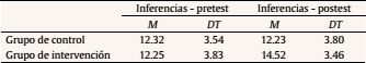 Inferencias. El análisis de varianza realizado a partir de los puntajes obtenidos a respuestas a preguntas de contenido inferencias del texto muestra un efecto de interacción entre la condición de intervención y el tiempo entre las evaluaciones, F(1, 125) = 20.178, MSe = 4.09, p < .001, η2 = .139. En este análisis hay efecto principal del tiempo (entre el pretest y postest, F(1, 125) = 17.372, MSe = 4.09, p < .001, η2 = .122, pero no del gupos, F(1, 125) = 3.222, MSe = 22.68, p < .075, η2 = .025. De nuevo, es el efecto de la interacción el que muestra que los del GI cambian significativamente más (y mejor) en la comprensión de inferencias que el grupo control. Mientras que en la medida pre la diferencia entre GI y GC fue de .07 puntos (p = .920, ns), en la medida post la diferencia entre GI y GC fue de 2.29 puntos a favor del grupo de intervención (p = .001). La Tabla 5 muestra las medias y desviaciones típicas pre y post para la comprensión de inferencias en ambos grupos.