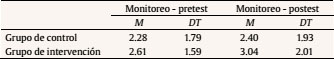 Monitoreo o autorregulación de la comprensión. El análisis de varianza llevado a cabo sobre la prueba de monitoreo de la comprensión de textos no detecta un efecto de interacción entre la condición de intervención y el tiempo entre las evaluaciones (F(1, 112) = 1.033, MSe = 1.330, p = .312, ns, = .009). Tampoco un efecto del tiempo entre las evaluaciones pre y postest, F(1, 112) = 3.078, MSe = 1.330, p = .082, η2 = .027, ni tampoco efecto principal del grupo, F(1, 112) = 2.361, MSe = 5.373, p = .127, η2 = .021. La Tabla 6 muestra las medias y desviaciones típicas del GI y GC en ambas mediciones, pre y post.