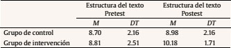 Estructura del texto. Por último, se examinó con una ANOVA el efecto del programa sobre la estructura del texto. Los resultados del análisis de varianza llevados a cabo a partir de las respuestas a preguntas acerca de la estructura del texto muestran un efecto de interacción entre la condición de intervención y el tiempo entre las evaluaciones, F(1, 125) = 8.394, MSe = 2.080, p = .004, η2 = .063. También se detectó un efecto principal del tiempo, F(1, 125) = 19.124, MSe = 2.080, p < .001, η2 = .133. El efecto principal del grupo no fue estadísticamente significativo, F(1, 125) = 3.524, MSe = 7.173, p = .063, η2 = .027. Nuevamente, es el efecto de la interacción el que permite afirmar que el cambio en el rendimiento de la macroestructura del texto no es el mismo entre antes y después de la intervención entre el GI y el GC. En particular, mientras que antes de la intervención la diferencia entre el GI y el GC fue de .110 (p = .802, ns), después de la intervención la diferencia fue de 1.20 a favor del GI (p = .001). La Tabla 7 muestra las medias y desviaciones típicas pre y post para estructura del texto en ambos grupos.