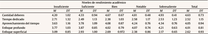 Tal y como puede verse en la Tabla 1, los resultados indican que a medida que el nivel de rendimiento académico de los estudiantes es más alto hay un aumento progresivo en la cantidad de deberes realizados y en el aprovechamiento del tiempo dedicado a los deberes. Por otro lado, como puede observarse en la Tabla 1, hay una disminución en el uso del enfoque superficial a medida que el nivel de rendimiento es más alto.