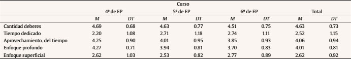 De esta forma, se observa que la cantidad de deberes no sufre cambios significativos en función de curso, pero sí cambia el tiempo dedicado a los deberes, el aprovechamiento de ese tiempo y la utilización del enfoque profundo.