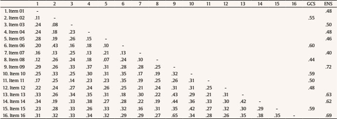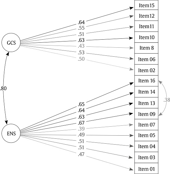 The results indicated acceptable internal consistency reliability for both the GCS (ω = .76) and ENS factors (ω = .70). Similarly, composite reliability values for GCS (CR = .75) and ENS (CR = .80), as well as average variance extracted for GCS (AVE = .30) and ENS (AVE = .31), suggest good model reliability (Hair et al., 2010).