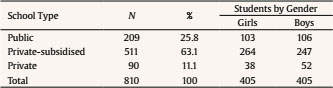 Participants were 810 Chilean second-grade students (50% boys; age, M =77.96 months, SD = 4.85) from 21 public, private, and private-subsidised schools. The empirical distribution of school types reflected the statistics reported by the Chilean Ministry of Education (MINEDUC, 2016), χ2(2) = 4.15, p =.13 (see Table 1 for descriptive statistics).