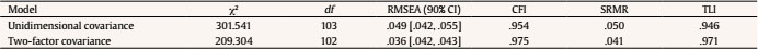 A comparison between the unidimensional model and the correlated two-factor model revealed a significant difference, Δχ2(1) = 68.384, p < .000. The latter presented a significantly better fit for the data than the unidimensional model and, as such, is considered the best of the two.