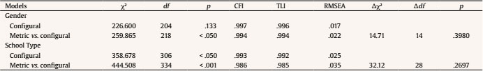 Finally, to test whether the factor structure found was similar between girls and boys and between schools (public, private, private-subsidised), multi-group CFAs were used to test the configural invariance. The test for configural invariance shows whether the same items are associated with the same construct. If fit indices are within the range of acceptable values, the configural model is considered invariant. When the configural invariance model is supported, metric invariance can be tested. This is achieved by constraining the factor loadings of similar items to be equal across the different groups. To determine the metric invariance of groups, a Δχ2 test was conducted (Sass, 2011). If the metric model does not differ from the configural model, metric invariance is inferred.