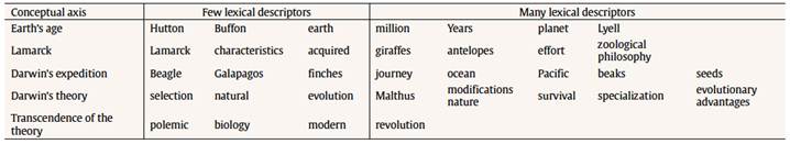 In the case of the Darwin text, four judges created a rubric to assess the quality of a student’s communication of the text’s main concepts, assigning 0 to 10 points to a summary. The Darwin text’s conceptual axes were “earth’s age” (maximum score = 2 points), “Lamarck” (max = 2), “Darwin’s expedition” (max = 2), “Darwin’s theory” (max = 3), and “transcendence of the theory” (max = 1). Each of the conceptual axes score given by the judges were summed to compose a final score (min = 0 and max = 10). The four judges’ reliabilities for their scoring of the Darwin text ranged between .89 and .93 (Pearson correlation).