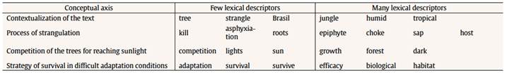 The analogous procedure was followed in creating a rubric for the Trees text. There were four conceptual axes for this text. The first conceptual axis referred to the proper localization of strangler trees (e.g., jungle areas, tropical areas, etc.). The second conceptual axis consisted of the description of the process of strangulation by means of the roots. The third conceptual axis was the fierce competition of the trees for reaching sunlight in the dense jungle. Finally, the fourth conceptual axis had to do with a general strategy of survival in difficult adaptation conditions. For the Trees text, another four judges independently assessed each of the 85 summaries written by the students. As in the Darwin text, each judge had to assign 0 to 2 points to each of the four conceptual axes created when establishing the rubric (not necessarily integer values) in order to compose a final score (min = 0 and max = 8). The reliability among the four judges ranged between .78 and .94 (Pearson correlation).
