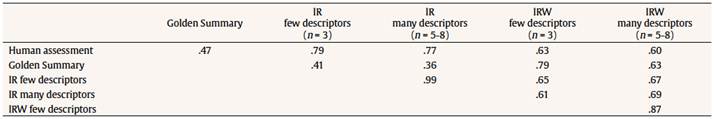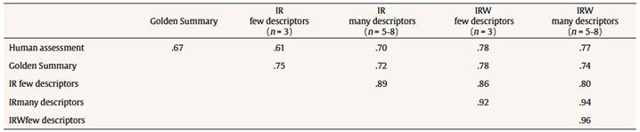 Regarding the Trees text (N = 85 High School students), Table 3 shows the correlation coefficients (reliabilities) between the different methods. It can be observed that the unweighted model versions had significantly higher LSA-human reliabilities than the weighted versions, κ2(2) = 9.496, p = .009. Moreover, the model with few descriptors seems to work better than an accommodated rubric with many descriptors, but in this case not in a substantive way. A substantive result is the Golden Summary method where its reliability is lower with respect to the Inbuilt Rubric method. For example, there were significant differences between the reliabilities of Inbuilt Rubric few descriptors (r = .785) and Golden Summary (r = .471), κ2(1) = 78.41, p < .001, and also between Inbuilt Rubric many descriptors/weighted (r = .601) and Golden Summary (r = .471): κ2(1) = 37.93, p < .001.