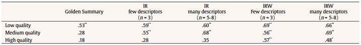 Regarding to the quality of summaries using human assessment as criteria, there were differences between Golden Summary and Inbuilt Rubric methods, with the Inbuilt Rubric performing better. But there were also differences within Inbuilt Rubric versions depending on the texts. Although the division by quality creates some range constraint, the differences and comparisons observed between both methods (and the manipulations of the Inbuilt Rubric method) allowed a finer analysis of why they worked in that way in the whole sample. This detailed analysis showed that all methods are able to discriminate between low-quality summaries. However, in high-quality summaries the Inbuilt Rubric method (especially the weighted version) was the only one able to discriminate between them. This result shows that the Inbuilt Rubric method is able to discriminate the amount of knowledge in all of the quality groups. In this way, some authors (Graesser et al., 2000) found that classic LSA assessments are more similar to intermediate experts than to more accomplished experts in the field, which means that the LSA can discriminate between better and worse summaries, but only a skilled method (like the new Inbuilt Rubric) can obtain finer assessments.