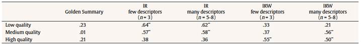 Regarding the Darwin instructional text (N = 81 university students), Table 4 shows that weighted versions (with few and many descriptors) have higher correlations. We analyzed whether there were significant differences between the reliabilities of the Inbuilt Rubric and the Golden Summary methods. Differences were found between Inbuilt Rubric weighted with few descriptors and Golden Summary methods, κ2(1) = 5.796, p = .016,, and also between Inbuilt Rubric weighted with many descriptors and Golden Summary methods, κ2(1) = 4.160, p = .041. Reliabilities between the unweighted versions and Golden Summary did not reach significance.