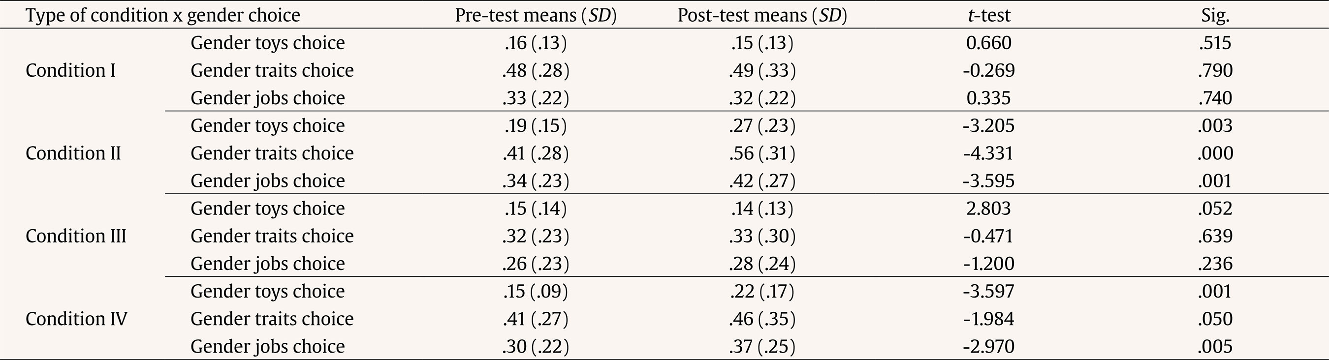 In relation to H1, using the paired sample t-test (see Table 1), we analyzed differences between flexibility in gender stereotyping in the three domains obtained in pre-test and that expressed in post-test, controlling for the four conditions. In condition I and condition III, statistical analyses revealed the absence of significant differences between pre-test and post-test in all domains. In condition II, statistical analyses showed a significant increase of flexibility in gender stereotyping in all three domains after the exposure to gender-inconsistent information included into the cartoon story with male character: for toys, t(33) = -3.205, p = .003, Cohen’s d = 0.60; for traits, t(33) = -4.331, p < .001, Cohen’s d = 0.74; and for jobs, t(33) = -3.595, p = .001, Cohen’s d = 0.62, with a large effect size. Finally, also in condition IV, the exposition to gender-inconsistent information included into the cartoon story with female character increased the flexibility in the three domains: for toys, t(45) = -3.597, p = .001, Cohen’s d = 0.53); for traits, t(45) = -1.984, p = .05, Cohen’s d = 0.29; and for jobs, t(45) = -2.970, p = .005, Cohen’s d =0.44, with a moderate effect size for toys and jobs and small effect size for traits.