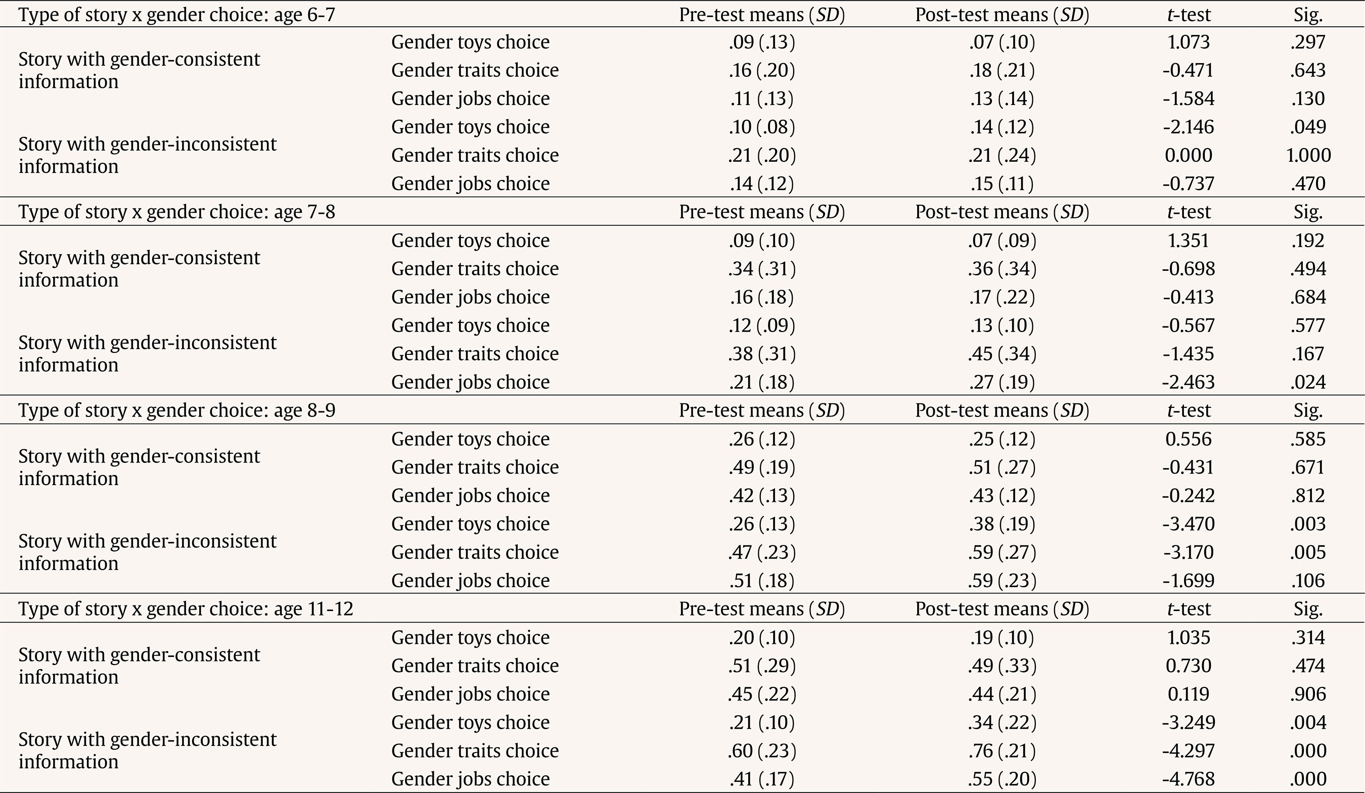 In relation to H2, we applied paired sample t-test to verify the differences between pre-test and post-test in all three domains, dividing the sample for age groups in relation to the type of story (condition I-III with gender-consistent information vs. condition II-IV with gender-inconsistent information). Results indicated that children exposed to gender-consistent information cartoon stories maintained their orientation in gender stereotyping, independently of their age. On the contrary, children exposed to gender-inconsistent information cartoon stories increased their flexibility of gender stereotyping in relation to their age: so, the oldest children (8-9 yrs. and 11-12 yrs.) increased their flexibility in all three domains (see Table 2) more than the youngest ones (6-7 yrs. and 7-8 yrs.).