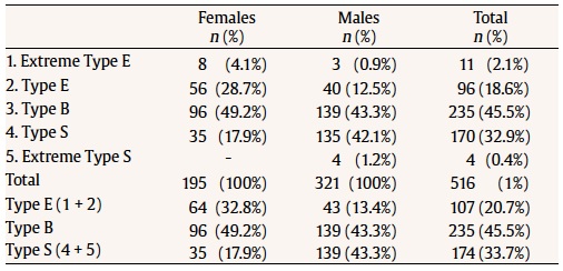 Using the method suggested by Auyeung et al. (2012) for adolescent EQ and SQ data, cognitive brain types were numerically assigned according to the percentiles of the typically developing group on the ‘D’ scale (D = difference between the normalized SQ and EQ scores/2). As can be seen in Table 1, the lowest scoring 2.5% were classified as Extreme Empathizing (Extreme Type E). Participants who scored between the 2.5th and 35th percentiles were classified as better at Empathizing (Type E). Those scoring between the 35th and 65th percentile were classified as ‘Balanced’ (Type B). Those scoring between the 65th and 97.5th percentile were classified as better at Systemizing (Type S) and the top 2.5% were classified as Extreme Type Systemizing (Extreme Type S). Additionally, because of the small number of participants classified as Extreme Type E and S, we tested gender differences between Type E (Extreme Empathizing and Empathizing), type B, and type S (Extreme Type Systemizing and Systemizing) groups. Chi-square analysis pointed out gender differences, 2(2) = 46.13, p < .001, among the cognitive brain type groups. Females were more likely to be classified as Type E than males and males were more likely to be classified as Type S than females.