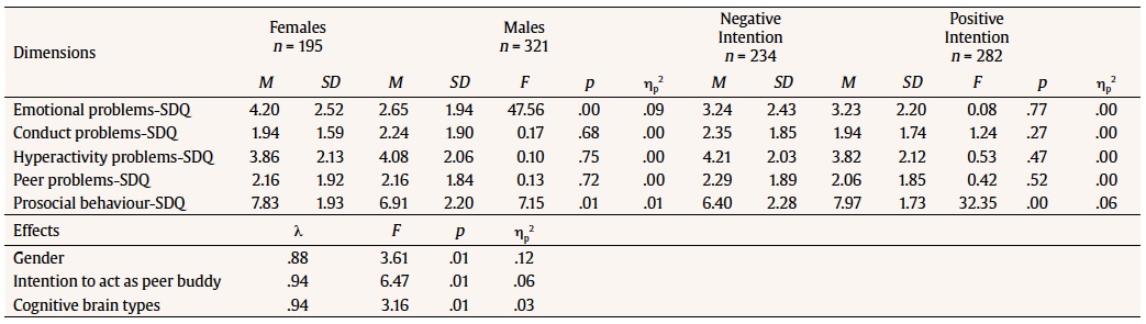 MANOVA revealed gender differences in the dependent variables, an effect of intention to act as peer buddy, and an effect of cognitive brain types. There was no effect of interaction between variables. Results from the univariate tests (ANOVA) revealed that: a) females obtained higher scores than males on Emotional Problems and Prosocial subscales, and b) adolescents who were more likely to volunteer differed only on the Prosocial subscale, obtaining higher scores than adolescents who did not express the willingness to become peer buddy, as depicted in Table 2.