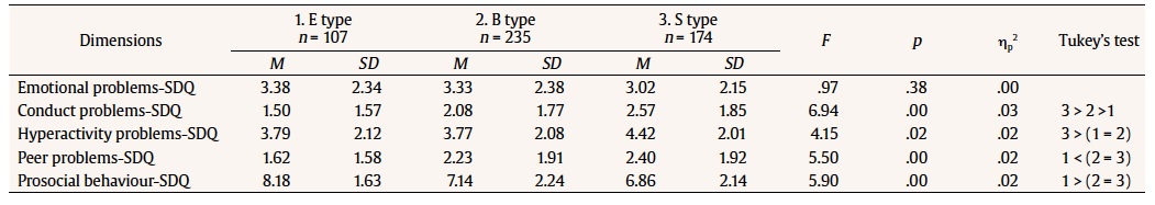 ANOVA and post-hoc (Tukey’s test, p < .05) revealed that the cognitive brain type groups differed on the Hyperactivity subscale, where E and B type groups, that did not differ from each other, obtained lower scores than the S type group; for Conduct problems, the S group obtained higher scores than B, and this group obtained higher scores than the E group; for Peer Problems, adolescents classified as S group obtained higher scores than E and B type groups, that did not differ; for the Prosocial subscale, the E group obtained higher scores than B and S groups that did not differ, as reported in Table 3.