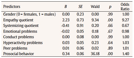 Another aim of the present study was to verify which emotional and behavioral variables predicted volunteering in ASD intervention. To do this, prosocial conduct and behavioral problems (e.g., hyperactivity, difficulties with peers, emotional problems) shown by each student were assessed. In line with what has already been found by past research (for meta-analytic review, see Jackson & Campbell, 2009), we hypothesized that prosociality would positively predict the intention to volunteer to become a peer buddy. With respect to emotional and behavioral problems, no specific results were expected. Perhaps, students with internalizing problems (e.g., emotional difficulties and peer problems) would accept less frequently to have a social role in the classroom as it is required to a peer buddy.