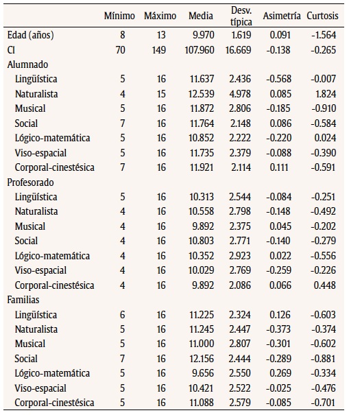 En este trabajo se empleó un diseño descriptivo-comparativo. En primer lugar, se analizaron los estadísticos descriptivos de cada una de las variables (ver Tabla 1), prestando especial atención a los valores de asimetría y curtosis, que el criterio de Finney y Di Stefano (2006) establece en unos valores de ± 2 y ± 7 para considerar esa distribución dentro de la normalidad. En segundo lugar, para conocer las diferencias entre hombres y mujeres en las siete inteligencias múltiples evaluadas, según el informante (alumno, profesor, familia), se realizó un análisis multivariado de la covarianza (MANCOVA), teniendo en cuenta el CI (medido a través del factor g) y la edad como covariables, e incluyendo un indicador de la magnitud del efecto (Ato, López y Benavente, 2013). Concretamente se utilizó como criterio la d de Cohen (1988), según el cual el efecto es pequeño cuando p2 = .01 (d = 0.20), medio cuando p2 = .059 (d = 0.50), y alto cuando p2 = .138 (d = 0.80). En tercer lugar, se analizaron las correlaciones entre la medida general de CI y cada una de las inteligencias múltiples evaluadas por los diferentes informantes, utilizando como estadístico la correlación de Pearson. Finalmente, con el objetivo de identificar aquellos estudiantes que, a juicio de ellos mismos, profesorado y familias, presentarían una inteligencia o aptitud excepcional en las diferentes inteligencias evaluadas, así como analizar el porcentaje de niños y de niñas incluidos en este grupo, se seleccionaron aquellos alumnos que presentaban una puntuación superior a 15 en las diferentes inteligencias. Este valor corresponde al percentil 95 de cada sub-escala, teniendo en cuenta que los valores pueden variar entre 4 y 16. Este criterio fue elegido por autores como Castelló y Battle (1998) para la identificación de estudiantes con diferentes talentos (lógico, verbal, etc.).