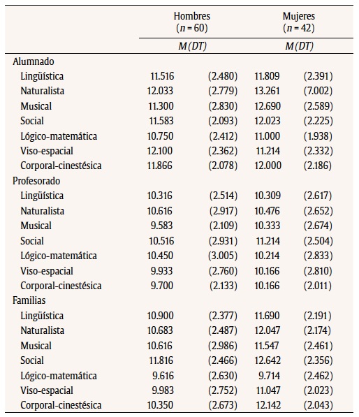 Con respecto a las inteligencias múltiples evaluadas a través del cuestionario aplicado a los alumnos, los resultados únicamente mostraron la existencia de diferencias estadísticamente significativas entre hombres y mujeres en inteligencia musical, F(1, 98) = 5.825, p = .018, p2 = .056 , a favor de las mujeres, y en inteligencia viso-espacial, F(1, 98) = 6.938, p = .01, p2 = .066, a favor de los hombres. En cuanto a las inteligencias múltiples percibidas por las familias, se hallaron diferencias estadísticamente significativas en inteligencia naturalista, F(1, 98) = 6.531, p = .012, p2 = .062 y corporal-cinestésica, F(1, 98) = 11.760, p = .001, p2 = .102, a favor de las mujeres en ambos casos.