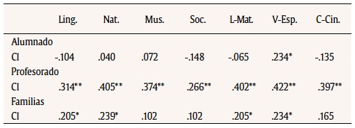 En cuanto a la relación entre inteligencias múltiples percibidas y la capacidad intelectual del alumnado, en la Tabla 3 se muestran las correlaciones entre el CI de los estudiantes y las puntuaciones proporcionadas por los diferentes informantes en las escalas de inteligencias múltiples.