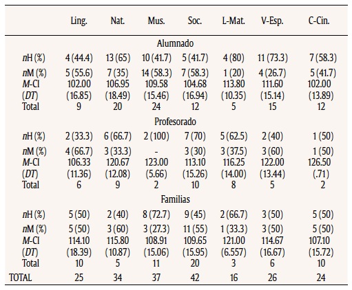 En lo referente al género, los alumnos identifican un mayor número de mujeres con niveles excepcionales de inteligencia musical, mientras que el profesorado y las familias identifican a un mayor número de varones teniendo en cuenta únicamente esta inteligencia. En el caso de la inteligencia social, tanto familias como alumnado identifican a un mayor número de mujeres que cumplen con el criterio de excepcionalidad. El profesorado, por su parte, identifica más hombres dentro de este sub-grupo. Finalmente, en cuanto a la inteligencia naturalista y lógico-matemática, en general, el número de varones identificados es mayor que el de mujeres, independientemente de los informantes.