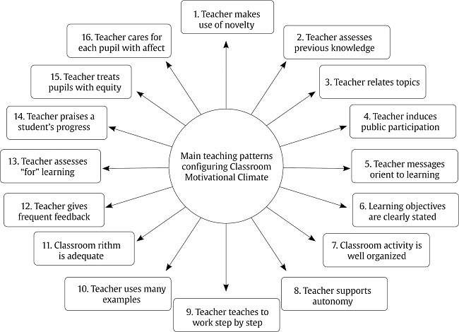 It is a known fact that the different components of classroom climate have important effects on students behavior, engagement, and achievement (Evans et al., 2009). One especially important component is classroom motivational climate (CMC) (Ames, 1992), a construct related to classroom goal structures (Alonso-Tapia & Fernández, 2008; Bardach et al., 2019). CMC is created by the teachers supporting and teaching actions that affect students motivation and learning, though it is usually assessed through the students perceptions. The CMC learning/mastery-oriented depends on the degree to which at least sixteen teaching patterns are present in the classroom organization and development (Alonso-Tapia & Fernández, 2008). These patterns are shown in Figure 1. Students themselves recognize that the more the CMC is learning-oriented, the more their interest, effort, perceived ability, self-regulation, success expectancies, and resilience improve (Alonso-Tapia, 2016; Alonso-Tapia et al., 2014; Alonso-Tapia, Ruiz, et al., 2020). Besides, there is abundant evidence on the positive effects of some particular patterns, not only on students perception but also on students engagement and achievement (Harbour et al., 2015; Lazowski & Hulleman, 2016).