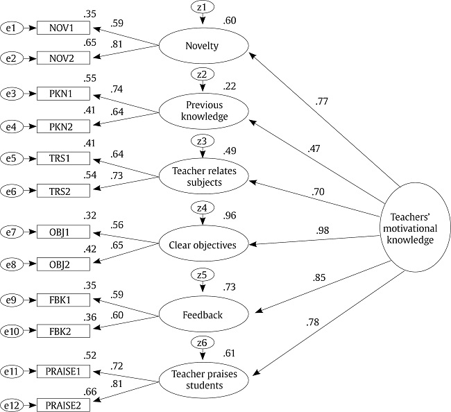 Analyses of baseline models.Figures 2 to 5 show the standardized factor loadings for the baseline CFA models. Table 1 shows the fit statistics for the baseline models (CFA1, CFA4, CFA7, and CFA10). In all cases, except CFA4, the statistic 2 was significant, probably due to sample size (Hair et al., 2010), but the 2/df ratio and the remaining fit indices were well inside the limits of the model acceptance. The only exception took place in the analysis of the Teachers Motivational Knowledge questionnaire (TMK), where the TLI and CFI indexes fell slightly short of the standard limits of significance.