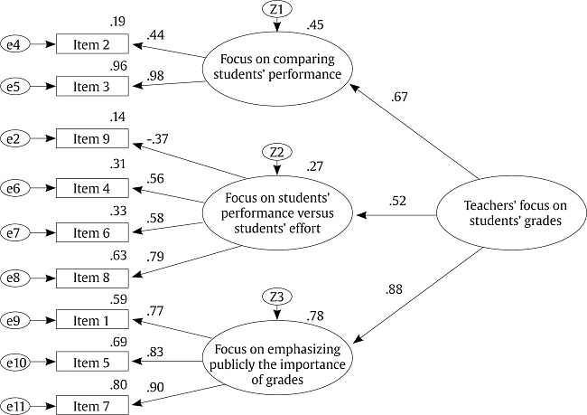 Teachers Focus on Students Grades (TFSG). This questionnaire has 9 items grouped in three subscales: 1) teachers focus on comparing students performance, 2) teachers focus on students performance versus students effort, and 3) focus on stressing publicly the importance of grades. The general scale is Teachers Focus on Students Grades.
