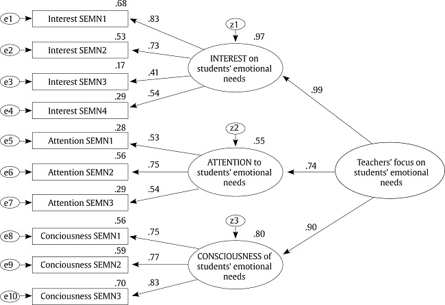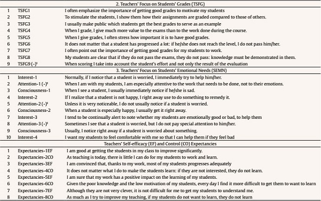 Teachers focus on students emotional needs (TFSEN). This questionnaire has 10 items grouped in three subscales: 1) teachers interest in students emotional needs, 2) teachers attention on students emotional needs, and 3) teachers consciousness on students emotional needs. The general scale is Teachers Focus on Students Emotional Needs.