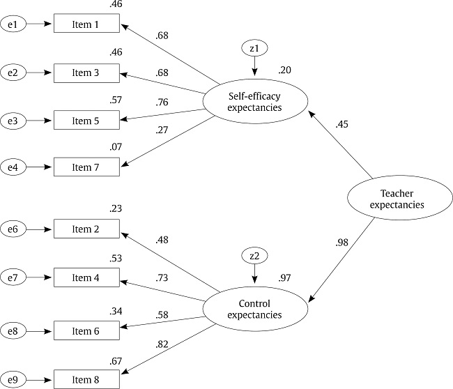 Finally, it is a well-known fact that teachers self-efficacy (TSE) and control expectancies (TCE) play an important role in classroom processes, student academic adjustment, and teacher well-being, as shown in the 40 years research synthesis by Zee and Koomen (2016). Expectancies seem to be positively linked to teachers behavior and practices related to classroom quality, and teachers psychological well-being. This fact implies that even if teachers motivational knowledge is adequate, even if they focus on performance and effort when grading their students, and even if they are fond of students and interested in their emotional needs, they may not act following such a knowledge. It may depend on the degree to which they believe that if teachers act in a determined way, this way of acting will allow obtaining a particular effect (TCE) and, especially, on the degree to which they believe that they will be able to act in such a way (TSE) (Alonso-Tapia, Quijada, et al., 2020; Bandura, 1997). Therefore, teachers expectancies are another motivational variable to consider for explaining both, teachers satisfaction with school and the classroom motivational climate that they create with their teaching patterns.