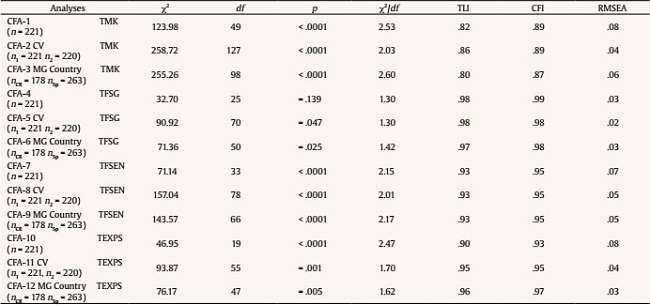 Results of the multi-group analyses by country are also displayed in Table 1 (CFA3, CFA6, CFA9, and CFA12). It shows that the statistic 2 was significant again in all analyses (probably due to sample size) and that, except in the case of the TMK, the rest of the models showed satisfactory goodness-of-fit indexes, according to the recommended cutoff values. In the case of TMK, the 2/df ratio and the RMSEA fit index attained acceptable values, whereas TLI and CFI indexes fell slightly short of the standard limits of acceptance. However, fit does decrease in the case of TMK, TFSG, and TFSEN if restrictions of parameter equality are imposed, but not in the case of TEXPS. In this case, fit did not decrease even if restrictions of parameter equality were imposed for measurement weights (D2 = 4.86, p = .56), structural weights (D2 = 5.06, p = .65), structural covariances (D2 = 5.59, p = .69), and structural residuals (D2 = 8.22, p = .51).