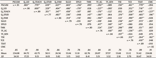 Table 2 shows in its diagonal Cronbachs reliability coefficient for the scales used in the study those corresponding to the new questionnaires and those corresponding to the scales used for studying the convergent validity of the new battery. McDonald indexes for the same variable are shown in a line at the bottom of the same table, just above the means. All reliabilities were adequate, except for Teachers Self-efficacy Expectancies (TSE) which fell slightly short of the threshold for acceptance.