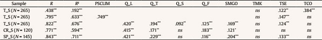 Two groups of regression analyses were realized. In the set group, in order the see the relative weight of the variables assessed by the new questionnaires for predicting teachers satisfaction, five regression analyses were carried out. In the first analysis, predictors were the scores in the TMK, and the questionnaires included in the TMP battery: teachers performance vs. effort orientation, teachers orientation to students emotional needs, teachers self-efficacy expectancies, and teachers control expectancies. In the second analysis, the score on teachers perception of school climate (PSCLIM) was added to the set of predictors used in the first analysis. In the third analysis, PSCLIM was substituted by its components. Finally, in the fourth and fifth analyses, similar to the third one in predictors and criteria, results from Costa Rican (CR) and Spanish (SP) teachers were compared. In all cases, the criterion was the score on the teachers satisfaction scale.
