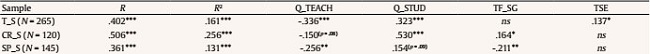 Second, correlations for all variables with teacher satisfaction (TSAT), a variable that will be used as the criterion in the regression analyses, show that correlations are not significant in some cases (SPGO, TFSG, TF_SEN). This lack of significance will be explained in the discussion below. Anyhow, only the variables whose correlation with teachers satisfaction was significant would be used in the corresponding regression analysis.