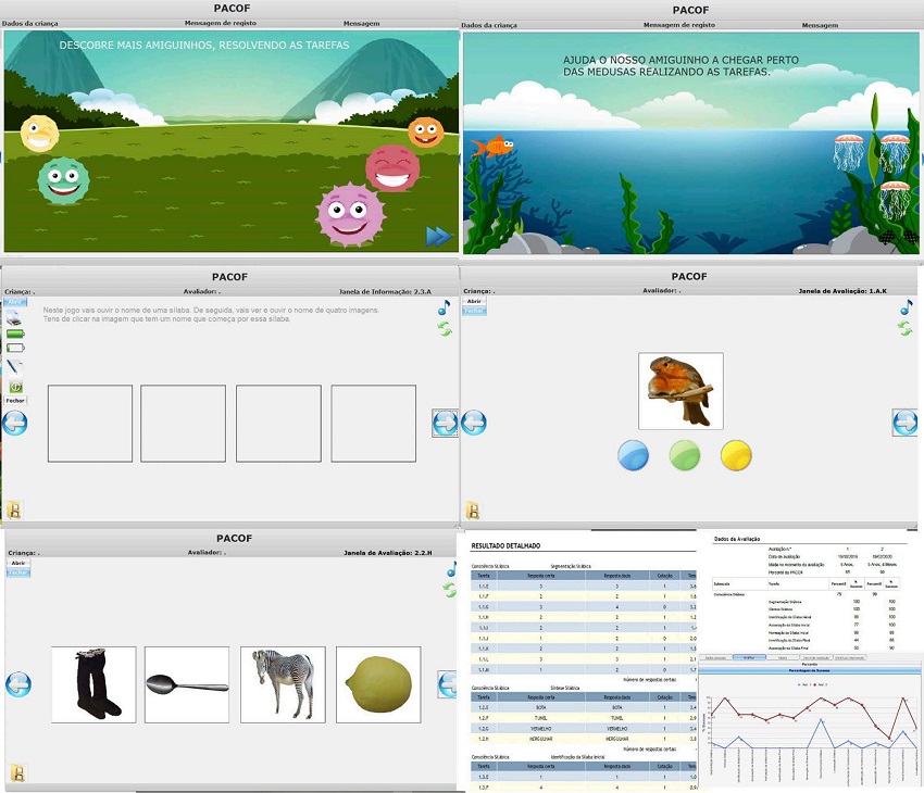 Phonological Awareness Assessment Test (PACOF). The PACOF comprises 141 items that are distributed among 18 tasks, which are grouped into three sub-scales: Syllable Awareness, Intra-syllable Awareness, and Phoneme Awareness. It is a computer-based test that is administered individually with no time limit. All the materials, including the instructions, are presented to the examinee through the software developed for the assessment. Similarly, all the responses of the assessed children are recorded and stored by the application. Each of the test’s tasks includes two sample items to familiarise the child with the proposed task and ensure that the instructions were understood. Figure 1 depicts some examples of the application.